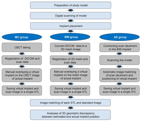 Workflow for this study. MC: Manual matching on a CBCT image; MM: Manual matching on a mesh model of a CBCT image; AS: Automatic matching on a scan abutment of the scan image.