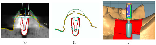 Critical anatomic structures such as the maxillary sinus, infra-alveolar nerve, and adjacent teeth must be considered while planning the positioning of dental implants before surgery [1]. The accurate placement of implants is essential to minimize periodontal, prosthetic, and esthetic complications [2,3,4]. Incorrect placement can decrease the longevity of implants due to serious complications [5,6]. Surgical guide templates have been traditionally used to transfer the planned position of implants into the oral cavity [7]. Conventional surgical guide systems are designed based on two-dimensional radiographic images and stone casts [8]; however, their fabrication is labor-intensive and incorporates only limited details of the gingiva and underlying bone structures [9]. With the development of medical imaging technologies, cone-beam computed tomography (CBCT) has been introduced for the diagnosis and planning of implant placement, enabling clinicians to evaluate the site of surgery by three-dimensional (3D) visualization [10]. Computer-aided design/computer-aided manufacturing (CAD/CAM) has also revolutionized the process of implant treatment and the fabrication of guide templates [11]; in this context, the guide template is designed using a dedicated computer software program, incorporating the sleeve parts for directing the osteotomy drills, where the design can be directly converted to a polymethyl methacrylate guide template with the aid of a subtractive or additive machining process [12]. Image-merging between CBCT and optical scan data not only facilitates the guide template fabrication process but also helps to enhance the accuracy and predictability of implant placement [13,14,15].