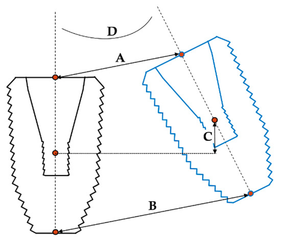 Discrepancy parameters between the estimated and actual 3D positions of implant. A: Linear deviation at the platform; B: linear deviation at the bottom; C: vertical deviation; D: angular deviation.