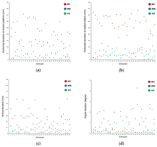 Scatterplot of deviations among the different methods used for implant detection: (a) linear deviations at the platform; (b) linear deviations at the bottom; (c) vertical deviations; (d) angular deviations.