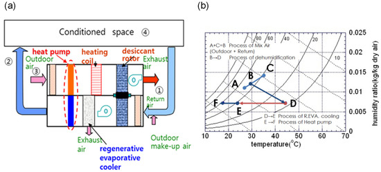 In Figure 1a, the upper part is the regeneration unit and the lower part is the desiccant unit. In the regeneration unit, the air heated through a heat pump and the district heating (heating coil) regenerates the desiccant rotor. In the desiccant section, a mixture consisting of 70% of the return air (A in Figure 1b) and 30% of the outdoor air (C in Figure 1b) is supplied to the desiccant rotor. The air that has passed through the desiccant rotor (D in Figure 1b) is cooled primarily through the evaporative cooler (E in Figure 1b). Then, it is additionally cooled while passing through the evaporator of the heat pump, and supplied as the cooling air to the room (F in Figure 1b). The design COPs of the evaporative cooler and heat pump are 0.64 and 3, respectively.