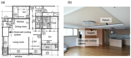 The test site was one of the apartment houses in Yongin-si, Gyeonggi-do, the floor plan and interior photos from which are shown in Figure 2. Here, the air-conditioning space covers the living room, dining room, and kitchen. The desiccant cooling unit was installed in one corner of the living room, and the cooling air was supplied from the top of the equipment. The total area of the cooling space was 126 m2. The air after cooling was recovered through a slot in the ceiling. Furthermore, there were windows on the front and side of the living room. Thermal comfort was evaluated without curtains on the windows.