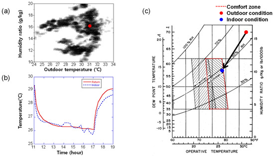 Typical Korean summer weather, characterized by a temperature of 31 °C and a relative humidity of 57%, was the outdoor condition on the day of the experiment (see the red dot in Figure 3a). This experiment was conducted on 13 August 2019. In the aforementioned residential space, the desiccant air conditioner was operated from 11 a.m. to 5 p.m. Figure 3b shows the room temperature and return air temperature during the cooling operation period. After the hybrid desiccant cooling system was initiated at 11 a.m., it entered a steady state in approximately 40 min, with the average indoor temperature of the cooling space at 26.7 °C and the absolute humidity at 10 g/kg. Thermal comfort was measured between 1 and 2 p.m.