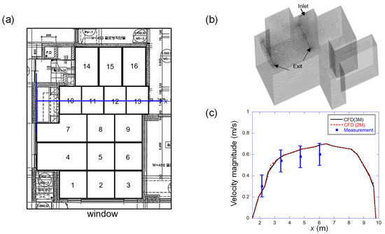 In Figure 4c, the numerical analysis results were validated based on the velocity profile in the dining room. First, it can be confirmed that the result obtained using 3 million grids agrees well with the result using 2 million grids to obtain a grid converged solution. Next, when comparing with the measurement data, the velocity profiles obtained via simulation at the four velocity measurement points agree well within the measurement error range.