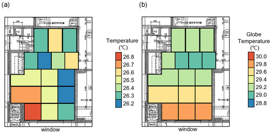 It should be noted that at the time of measurement, the average radiant temperature was measured without a shade. Therefore, there is a significant difference of 3.4 °C between the black bulb temperature distribution (shown in Figure 5b) and the dry-bulb temperature distribution (shown in Figure 5a). The globe temperature was clearly higher near the southern window, but was also higher than the dry-bulb temperature in other areas where direct sunlight was not shining. Overall, it showed a distribution of 28.8–29.8 °C, which is at least 2 °C higher than the dry-bulb temperature.