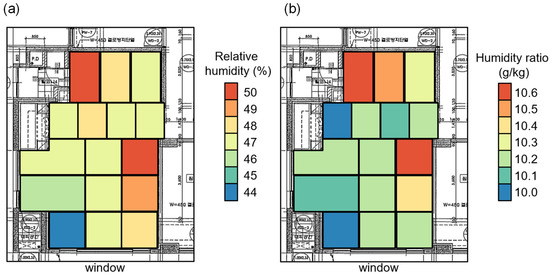 The standard ASHRAE comfort zone is dictated by the dry-bulb temperature and relative humidity; however, in the PMV calculation, humidity is considered as the partial pressure of water vapor, which is known to be directly related to the humidity ratio. Figure 6b shows the humidity ratio obtained from the dry-bulb temperature in Figure 5a and the relative humidity in Figure 6a. Based on the figure, the humidity ratio ranged between 10.0 and 10.6 g/kg, while the shape of the overall spatial distribution was similar to that of the relative humidity depicted in Figure 6a.