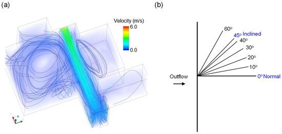 Airflow distribution and supply angle: (a) three dimensional streamlines from CFD for normal supply (0°); (b) cooling air supply angle.