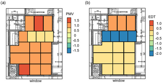 Because the factors of EDT are affected by PMV, EDT and PMV have a strong correlation in the laboratory environment without direct sunlight [26]. However, in a residential environment with windows and direct sunlight, it was found that the two factors locally conflict with each other due to different distributions of radiant temperature and air current. Therefore, in the present study, a discharge angle with optimal thermal comfort was found between PMV and EDT in a residential space where desiccant cooling was performed.