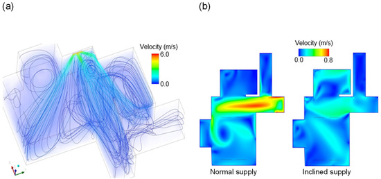 Meanwhile, in the EDT distribution shown in Figure 8b, a value of at most −1.7 was recorded in the dining room due to the high-velocity airflow. In Figure 9b, the velocity distribution in the case of supplying the cooling air vertically from the discharge surface, and that of supplying it at a 45° upward angle, were compared at a height of 1.1 m. As can be seen from the two velocity contour plots in Figure 9b, the high-speed area that existed in the dining room (red-to-yellow color) was removed when the cooling air was supplied at a 45° upward angle, as shown on the right.