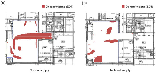 Changes in discomfort areas evaluated by EDT (EDT < −1.7 or EDT > 1) according to the change in the cooling air supply angle: (a) normal supply; (b) 45° upward supply.