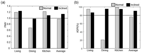 From a comparison of the black and gray bars in Figure 11, it could be inferred that the guide vane was adjusted to supply the cooling air at a 45° upward angle (black bar), after which the cooling performance became spatially more uniform. As reflected in Figure 11a, the PMV for the entire cooling space slightly exceeded 1.0 when cooling air was supplied upward by 45°. This means that it had entered a slightly hot area; thus, if the cooling effect is to be even across the space based on PMV, then the cooling capacity should be slightly increased.