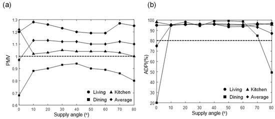 Changes in thermal comfort according to cooling air supply angle: (a) PMV; (b) ADPI.