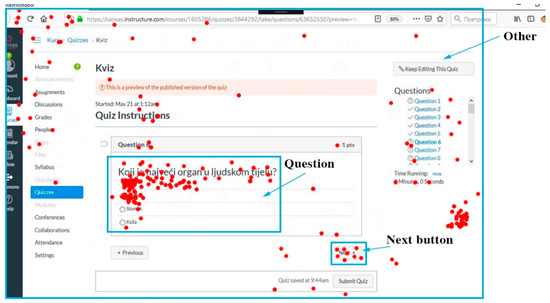 The method was created using the Python programming program using the OpenCV library. The individual records in the form of points were divided into several clusters based on the nearest squares’ method. In the research, we divided the records into several parts, the place of the question, the place of the “next” button and other records. The same method was repeated for each student [39,40,41].