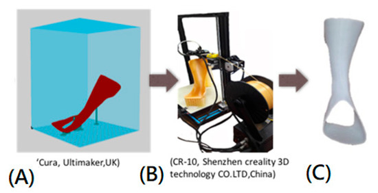 Fifteen traditional AAFOs (TAAFO) and fifteen 3DP-AAFOs were respectively fabricated. The 3DP-AAFO was fabricated from a solid foot model. The software Cura (Ultimaker, Inc., Geldermalsen, The Netherlands) was used to slice solid models and were printed in polylactide (PLA) material, as shown in the Figure 1. The printing parameters were 0.2 mm in layer thickness, 100% in density, 205° in printing temperature, and 60 mm/s in printing speed. A 3DP-AAFO was fabricated in seventeen hours and weighed about 118 g. In this work, traditional thermoplastic materials (polypropylene) were used for manufacturing traditional AAFOs.