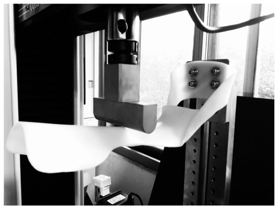 To realize the difference between the TAAFO and the 3DP-AAFO, mechanical testing was conducted in terms of stiffness and ultimate load. Fifteen degrees of plantarflexion was given to all AAFOs [19] to measure the stiffness using the material testing machine (HT-2402 Computer Servo Control Material Testing Machine, Hung-ta Co. Ltd., Taichung, Taiwan). An indenter slowly moved at a constant rate (20 N/min). The AAFOs were also loaded through the full range of motion until the AAFOs were broken to measure the ultimate load [12]. The vertical displacements of the AFOs were recorded from the load cell, as shown in Figure 2.