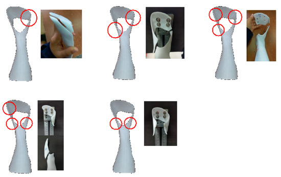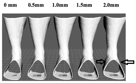 The FE software ANSYS workbench 14.5 (ANSYS Inc., Canonsburg, PA, USA) was implemented in the study. The PLA material was set up with a Young’s modulus of 3500 MPa and a Poisson ratio of 0.36 for the FE model of 3DP-AAFO [20]. The FE model was simulated using solid elements in 12,722 elements and 24,848 nodes, as shown in Figure 3. The bottom of the 3DP-AAFO model was fixed completely. Under the same loading condition as the mechanical testing, the moment was subjected to the FE model to produce 15° of plantarflexion. For the FE model validation, the displacement was compared between the FE analysis and mechanical testing under a given moment 16.7 Nm (15° in plantarflexion). As to the displacement, the 3DP-AAFO model was calculated in 29.2 mm in FE analysis, and the TAAFO specimen was measured at 27.9 mm in the mechanical test. The difference of the displacement was only controlled in 4.7%. Therefore, the 3DP-AFFO model was validated. The original thickness of the 3DP-AAFO was 3.2 mm. To increase its strength, the AAFO model was thickened on the neck in terms of 0.5 mm, 1.0 mm, 1.5 mm, and 2.0 mm, as shown in Figure 4. Apart from the plantarflexion, 15° of dorsiflexion was also applied to the 3DP-AAFO model. Since 3D printing products of additive manufacturing tend to be fractured in tensile force, the study collected the maximum principal stress for comparing the different FE models.
