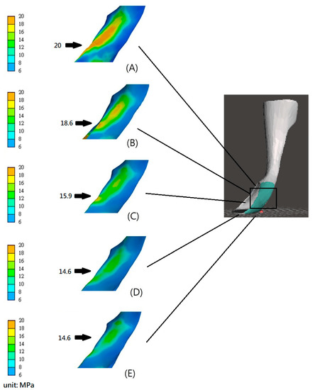 Stress distribution of the 3DP-AAFOs with different thicknesses around the neck in plantarflexion (A) 3.2 mm, (B) 3.7 mm, (C) 4.2 mm, (D) 4.7 mm, and (E) 5.2 mm. Note: Arrows indicate the location of the maximum stress.