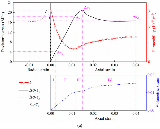 The stress-permeability-strain evolution of tectonic coal under triaxial compression is depicted in Figure 3a. According to the coal deformation trend, the entire compression process can be divided into four stages: the compaction stage (Ⅰ), the linear elastic stage (Ⅱ), the yielding stage (Ⅲ), and the post-destruction stage (Ⅳ) [31]. During the compaction stage, the primary pores and fractures in coal are gradually compressed with the increase of deviatoric stress. As a result, the axial strain and volumetric strain increase and the permeability of coal decreases accordingly. However, the radial strain has remained approximately constant mainly due to the confinement of confining pressure. During the linear elastic stage, the primary pores and fractures in coal continue to close. The radial strain has a slight increase, and the axial strain and volumetric strain increase linearly with the increase of deviatoric stress. Moreover, the coal permeability almost drops to its minimum because of no new pores and fractures are generated [32]. During the yielding stage, the coal expands to the radial direction obviously; however, the increase rate of axial strain and volumetric strain begin to drop slowly. At the same time, the coal permeability starts to rebound due to more and more new fractures and cracks are produced with the increase of deviatoric stress. During the post-destruction stage, the deviatoric stress decreases with the increase of the axial strain, radial strain, and volumetric strain. The coal permeability increases furtherly with forming more and more macro-cracks.