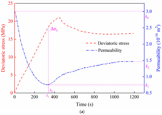 Stress-permeability-time curves of coal under triaxial compression. (a) tectonic coal and (b) intact coal.