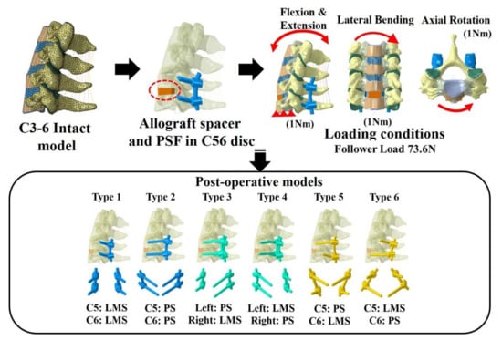 Six types of postoperative posterior fixation models (Type 1: all LMS, Type 2: all pedicle screws (PS), Type 3: left (Lt) PS and right (Rt) LMS combination, Type 4: Lt LMS and Rt PS, Type 5: upper PS and lower LMS, and Type 6: upper LMS and lower PS) were constructed by modifying the intact model to simulate device implantation at C5–C6 (Figure 1).