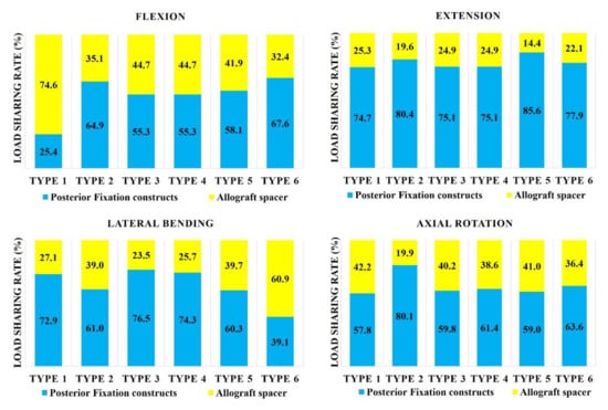 Load sharing on allograft spacers and posterior fixation constructs. Type 1: all LMS, Type 2: all PS, Type 3: left (Lt) PS and right (Rt) LMS, Type 4: Lt LMS and Rt PS, Type 5: upper PS and lower LMS, and Type 6: upper LMS and lower PS.