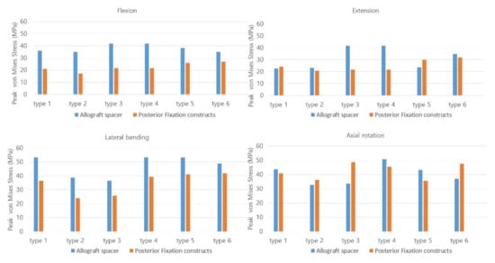 In flexion mode, the PVMSs of the allograft spacer and PFCs were lowest in the Type 2 model (Figure 3). In extension mode, the PVMS was highest in the allograft spacers in the Type 3 and 4 models and the PFCs in the Type 5 and 6 models. During lateral bending, the PVMSs of the allograft spacers and PFCs were lowest in the Type 2 and 3 models. In the axial rotation mode, the PVMSs of the allograft spacers and PFCs were lowest in the Type 2 model. The PVMSs were highest in type 3 of the PFCs and in Type 4 of the allospacer.