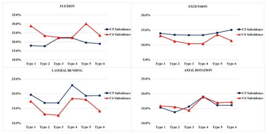 In the extension mode, the Type 6 model (2.45 MPa, 15.0%) yielded the highest subsidence risk on C5, and the Type 5 model (2.189 MPa, 13.4%) yielded the highest subsidence risk on the C6. During lateral bending, the Type 3 model (2.746 MPa, 16.8%) had the lowest projected subsidence risk on C5 and (2.061 MPa, 12.6%), also, on C6. This can be explained by a PS counterforce opposing the lateral bending force. Contrarily, in the Type 4 model, the lateral bending force was supported by the lateral mass screw. Accordingly, the highest subsidence risks (3.726 MPa, 22.9%) on C5 and (2.994 MPa, 18.4%) C6 were associated with the Type 4 model, because asymmetry on the LMS side caused excessive LMS-side compression forces. In the counterclockwise axial rotation, the Type 4 model (3.092 MPa, 19.0%) had the highest risk of subsidence on C5 and (3.076 MPa, 18.9%) C6. This model had the PS and LMS parallel to the counterclockwise rotation force, which would enable pulling forces that could displace the screws. The Type 2 model, which was all PS, had the lowest subsidence risk during counterclockwise rotation.