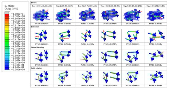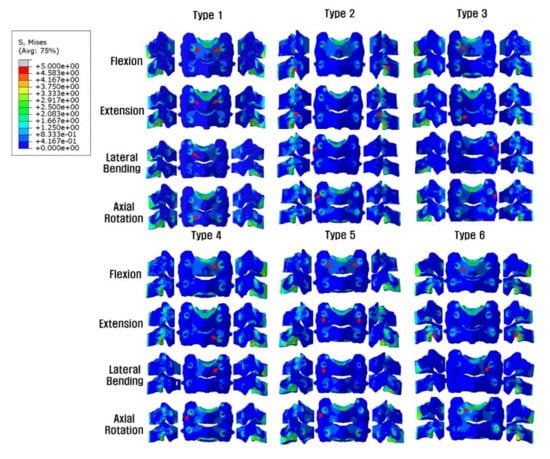 In general, the Peak von Mises stress of a screw was higher in the LMS than the PS (Figure 6). The Type 2 model had the lowest calculated PVMS in all motion modes. In flexion and extension modes, when both LMS and PS were included, the Type 3 and 4 models demonstrated the highest PVMS, which occurred around the C5 LMS neck area. In the lateral bending mode, the Type 6 model demonstrated the highest PVMS near the C6 PS rod. Additionally, in the lateral bending mode, the Type 2 model demonstrated the lowest PVMS, which occurred near the inlet of the vertebral body pedicle. During the axial rotation mode, the Type 3 model had the highest predicted PVMS around the LMS neck on the C6 area. In the Type 6 model, the PVMS was highest near the LMS neck on C5. In this area, the counterforce was applied counterclockwise against the rotation force. All of the models demonstrated very low values with respect to the yield of the strength of titanium (880 MPa).