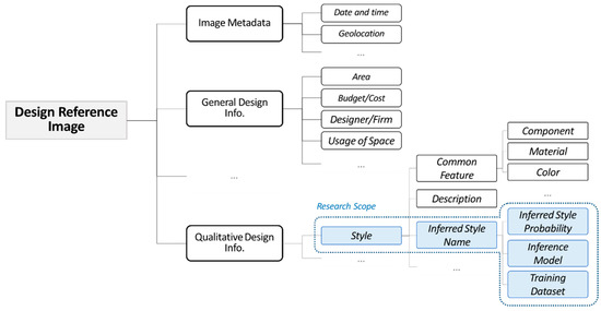 Design reference images are useful because they contain significant information for design decision making. In practice, most platforms on which design projects are shared provide reference images with various types of information. The provided information includes image metadata, general design information, qualitative design information, etc. Figure 2 presents a conceptual structure of the information contained in design reference images. A proposed style recognition model automatically appends style and its related data on given images.