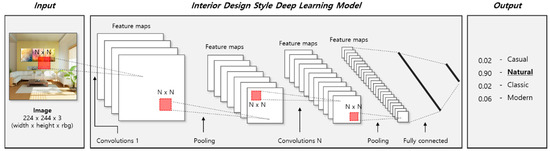 To overcome this problem, a deep learning-based image recognition method was adopted to determine the interior design style for reference images. Deep learning and convolutional neural networks (CNNs) are data-driven approaches for the independent identification of significant patterns of given images [8]. Deep learning and CNNs have demonstrated that computers distinguish general objects (e.g., dogs or cats) and specific domain things (e.g., faces and room usage) [9]. They can also be applied to qualitative problems, such as the Go game, in which the best rather than the correct answer is determined [10]. In this study, rather than defining what styles of interior design are or finding a classification criterion, a data-driven method to infer design styles of given interior design reference images using a CNN is proposed, and an application for improving the efficiency of the use of design reference images using design style recognition model is depicted.