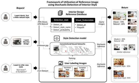 This section describes the application of design reference images supported by stochastic detection (Figure 7). In this application, the design style recognition model and design reference image database play important roles. The proposed model detects the styles of the input reference images and extracts visual feature data from images. These data are used to retrieve reference images based on keywords or to recommend similar design style reference images. Scenario (1) demonstrates that the interior design styles of reference images that users input are automatically identified and saved in the database. Designers and reference managers can use the database to create their own collections of references. Common clients can identify which styles they want and view the related styles. Furthermore, scenario (2) demonstrates that a more detailed retrieval of references is possible with design style keywords and probability values. In scenario (3), users can implement and use the proposed style recognition model constructed with the reference datasets according to user-defined styles.