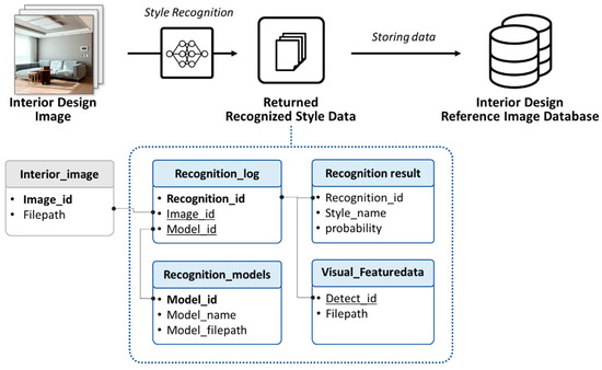 The data returning from the style recognition are stored in a recognition result table and visual feature map table in the database. The recognition result table contains recognition IDs, recognized style names, and probability values as attributes. One image can have multiple style names (this study considered four values).
