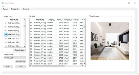 By using the trained model and Python graphical user interface (GUI) interface development library, a prototype application was developed (Figure 9). A user can input design reference images that do not contain design style information. The application provided an option to select the recognition model. The recognition results are presented in table view with the image, so the user can check each recognition case and selectively change the results if a result is not reliable.