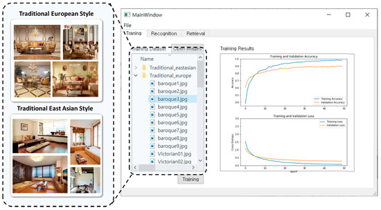 This scenario describes the implementation of another interior design style recognition method with different style image datasets. Figure 11 presents the results of the CNN model training for two different styles: (1) a traditional East Asian style including traditional South Korean, Japanese, and Chinese styles; and (2) a traditional European style including Baroque, Rococo, and Victorian styles. Users can easily train a new model with a custom dataset and the GUI. Such a custom style recognition model can then be used to develop additional data tables for each reference image.