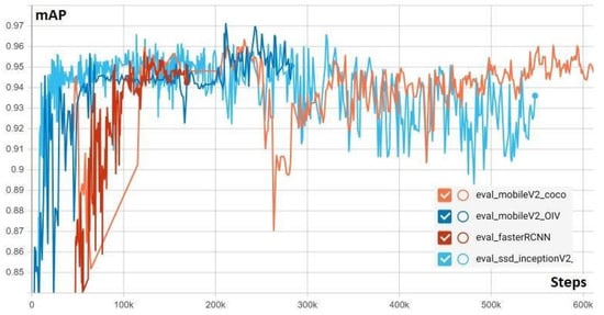 The experiments in this paper have been performed using Tensorflow Object Detection API. The training was performed on a Local Deep Learning Server with a GPU RTX 2080 Ti, 11 GB GDDR6 352-bit RAM, 1.6 GHz processor, and 4352 CUDA cores, while the evaluation took place on the server’s CPU equipped with i7 Core 8th gen, 4.6 GHz, 6 cores, and 12 threads. This allowed us to train our SSD models with an average step speed of 0.3 s, meaning that training one network for 300 k steps took around 25 h. As for the Faster R-CNN, the average step speed was 0.7 s, meaning that training one network for 300 k took around 58 h. After training the model, the resulted graph was frozen and transformed into an inference model. Our inference model was run on a Raspberry Pi3+ processor with an USB extension for Neural Network Processing, which led to speeds of 9 frames per second (FPS) for SSD architecture and to 4FPS for Faster R-CNN.