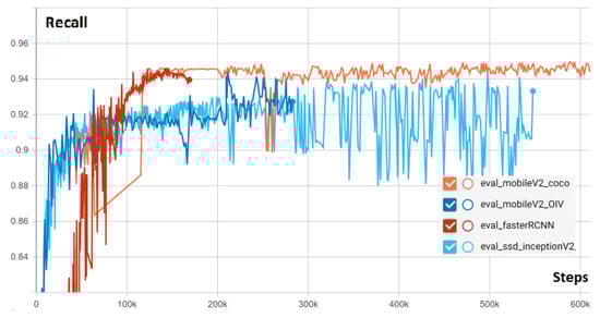 In Figure 3, the recall of all trained models is evaluated. As in the case of mAP, the model with the best results in terms of recall is the SSD MobileNetV2 pre-trained on the COCO dataset, followed by Faster R-CNN and Inception V2.