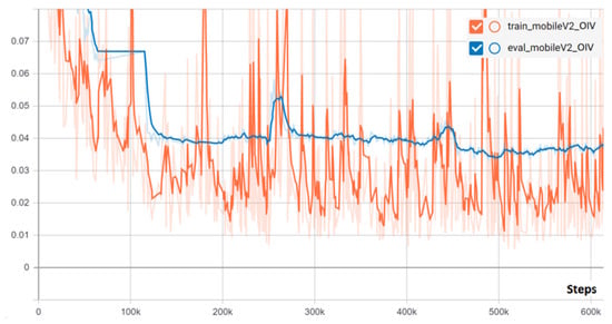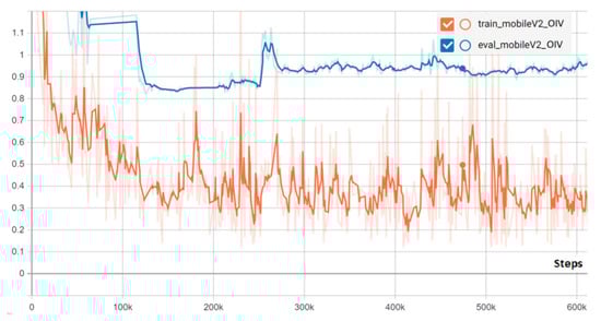 In order to check the models against overfitting, the training and evaluation losses during the entire training have been taken into account. In Figure 4, the classification loss of the most accurate model, the SSD MobileNetV2 network pre-trained on OID V4, is presented during training and evaluation. One can observe that the validation and training losses converge on the same graph, meaning that the CNN manages to generalize well and the images in the training set are accurately detected. The evaluation loss converges to a minimal value around 0.75 after 200 k steps. Due to the fact that the learning rate has been adjusted manually at some checkpoints, there are some sharp increases in the evaluation loss but returns to the prior variation when the changes are undone and meta-parameters are better adjusted. The training and evaluation errors decrease fast during the first part of training (50 k steps). After 50 k steps, the losses decrease on a smoother slope until 150 k steps. From that point on, the classification loss starts to converge until 220 k, when the model begins to overfit (the training loss fluctuates around 0.4, while the validation loss increases). The same evolution has been observed for other models. In order to avoid overfitting, the inference graph of the model has been generated from the checkpoint created at the 203 k step, when the network starts to lose its ability to generalize.
