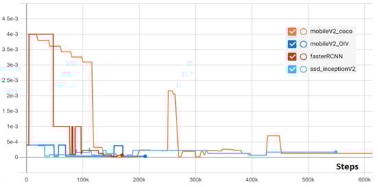 In Figure 6, the learning rates during training are presented. For two of the models, the training starts with a value of 0.004 and decreases until reaching 0.00001 (1 × 10−5), switching from an exponential to a step decrease. The other two models start from a lower value of 0.0004 until reaching 1 × 10−5.