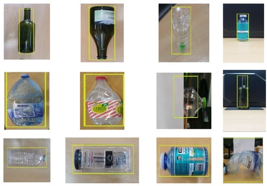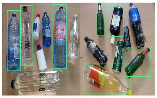 Figure 8 presents the main case study detections successfully performed. The plastic and glass bottles in the image are placed in different positions (including bottom up), are partially obstructed, deformed, with different shapes, etc.