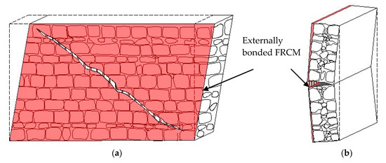 The use of composite materials for strengthening existing masonry structures is a topic of great interest among civil engineers. Fiber-reinforced polymer (FRP) systems, which belong to the family of composite materials, comprise fibers of different kinds, such as glass, steel, aramid, and carbon impregnated with a polymeric matrix (typically epoxy resin). Although FRPs have been widely used over the past decades to strengthen concrete and masonry structures [1,2,3], there are some disadvantages, mainly associated with the use of epoxy matrices, such as poor performance at high temperatures and poor vapor permeability, high costs, inapplicability on wet surfaces, hazardous fumes for workers, and incompatibility with the substrate. Therefore, a new type of composite with the same type of fibers organized in an open-mesh textile embedded in an inorganic matrix, instead of a polymeric matrix, has been recently employed. Due to their advantages, such as compatibility with different types of substrate and high vapor permeability, these new materials, usually referred to as fiber-reinforced cementitious matrix (FRCM) composites [4], are considered an effective system to strengthen historical masonry structures [5]. When a unidirectional textile made of high strength steel fibers is employed, FRCMs are named steel-reinforced grout (SRG). Numerous experimental campaigns were conducted in the last 15 years to investigate the contribution of externally bonded FRCMs and SRGs to the load-carrying capacity of concrete and masonry members. These studies showed an increase in the bending [6,7,8], shear [9,10,11], and axial capacity [12,13,14] of FRCM/SRG-strengthened reinforced concrete (RC) members that are comparable with the counterparts strengthened with FRPs. Analogously, FRCMs and SRGs were proven to be effective to increase the in-plane and out-of-plane strength of masonry walls (see Figure 1a,b, respectively) [15,16,17], axial strength of masonry columns [18,19,20], and the load-carrying capacity of masonry arches [21,22].