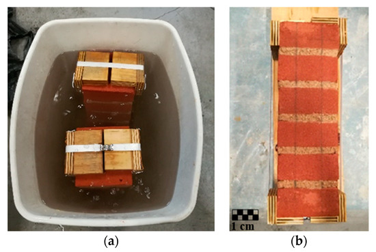 Before applying the composite, all the masonry blocks were left to soak in a bucket filled with water for at least 20 min (Figure 2). This procedure was necessary to avoid water absorption by the masonry surfaces during the application of the SRG composite