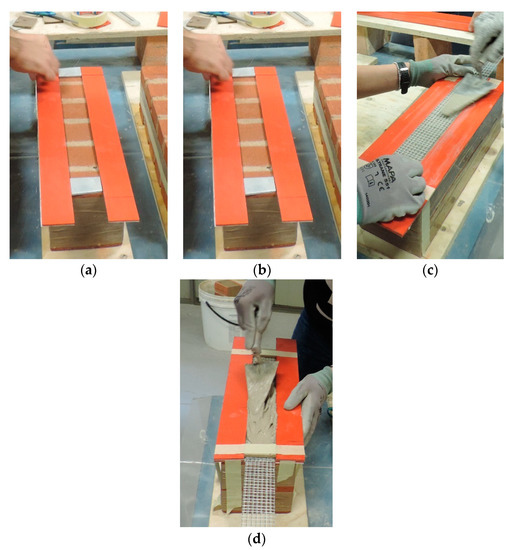 Phases of application of SRG reinforcement: (a) delimitation of the bonded area; (b) application of the first layer of mortar matrix; (c) application of steel fiber sheet; (d) application of the second layer of mortar matrix.