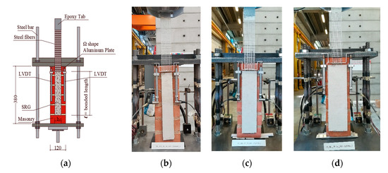 Bond properties of SRG composites bonded to masonry blocks and concrete prisms were evaluated using the classical push–pull single-lap direct shear test set-up. Tests were conducted under displacement control using a closed-loop servohydraulic universal testing machine with a capacity of 100 kN. The set-up already described in [35] was employed (Figure 3). Two linear variable displacement transducers (LVDTs) were used to control the test. The LVDTs were mounted on the substrate through two holders, and they reacted off of a Ω-shaped aluminum plate mounted on the bare fibers at the beginning of the bonded area (Figure 3). The average of the two LVDTs mounted at the beginning of the bonded area was named global slip (g). The global slip g was increased at a constant rate equal to 0.00084 mm/s (standard test rate). However, for three SRG-masonry joints, the test rate was increased 10 times, i.e. 0.0084 mm/s. It should be noted that the rate employed for the majority of the tests (i.e. 0.00084 mm/s) was previously assessed through an extensive experimental work, and it was concluded that it was adequate to capture the debonding onset and propagation in FRP- and FRCM-concrete joints effectively [44,45]. In this paper, a test rate higher than the standard test rate was adopted to investigate the existence of rate effects on the composite bond behavior and a potential decrease in the amount of time needed to carry out bond tests on this type of material.