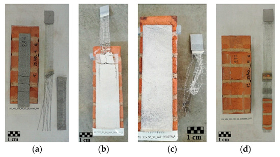 Failure modes of representative specimens: (a) interlaminar failure with debonding at the interface between the internal layer of mortar and steel fibers (MF); (b) partial interlaminar failure at the interface between the internal layer of mortar and steel fibers (MF*); (c) rupture of fibers (FR); (d) detachment of the SRG strip from the substrate with a thin layer of masonry attached to it (SF).