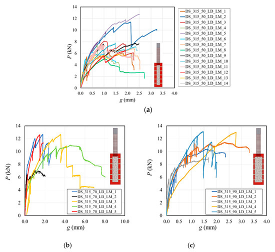 For fourteen SRG-masonry joints, the width of the SRG matrix was equal to the width of the steel fiber sheet, i.e., 50 mm, and their behavior in terms of P versus g is shown in Figure 6a. The SRG matrix of the remaining blocks had two different widths: Figure 6b shows the results of SRG-masonry joints with matrix width equal to 70 mm, while Figure 6c shows the load response of specimens with the matrix width equal to 90 mm. The load responses were quite scattered even among specimens that belong to the same group, due to the variability of the mortar employed for the SRG matrix [35].