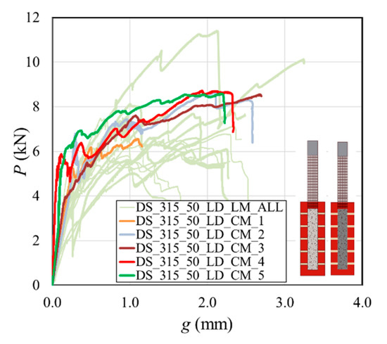 In this Section, load responses of masonry blocks strengthened with cement-based matrix SRG are shown and compared with those of masonry blocks strengthened with lime-based matrix SRG (Figure 7). The matrix width for all the specimens compared in this Section was equal to 50 mm, i.e. it was the same as the width of the fiber sheet. The light green curves represent the masonry blocks strengthened with lime-based matrix SRG (herein called together as DS_315_50_LD_LM_ALL).
