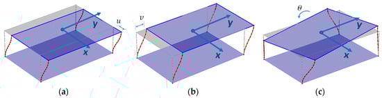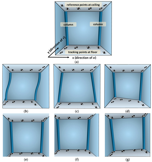 While Figure 3 presents the basic idea of the proposed method in two dimensions, the real world is three-dimensional. Figure 4 demonstrates images taken by a camera installed to align with the ceiling of the monitored story. Figure 4a presents the un-deformed inter-story. The positions of the tracking points and the reference points are continuously tracked by the camera of the single-board computer. Figure 4b–d presents the inter-story responses of u, v, and θ, respectively, images that represent the proposed inter-story motion model. Figure 4e–g presents the model motion of the unintended camera movement, which include the pitch, yaw, and roll, respectively. While the unintended camera movement can theoretically also have translational movements, only three rotational movements are considered here because images are generally much more sensitive to camera rotations than translations. Even a minimum camera rotation can induce significant image movement. Simplification of the camera movement can also simplify the nonlinear simultaneous equations that will be introduced later, easing the convergence of their numerical solution.