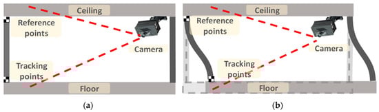 The technical basis for monitoring the inter-story response by a single camera is to monitor the positions of two sets of targets in the images: tracking points and the reference points. It is assumed that the camera is fixed to the ceiling above the story that is being monitored, with the target points referring to objects that are fixed to the floor of the monitored story, and the reference points being objects fixed to the ceiling of the monitored story. When inter-story deformation occurs, the positions of the tracking points in the image taken by the camera change, as shown in Figure 3. By analyzing the movements of the tracking points in the images, the inter-story responses can be estimated. The reference points, which are affixed to the ceiling, are used to estimate the possible unintended movement of the camera. Even a minimal unintended movement of the camera can induce a relatively large change in tracking point and reference point positions in the image. To prevent obtaining incorrect inter-story responses, the movement of the camera needs to be estimated so that a more accurate inter-story response can be obtained.