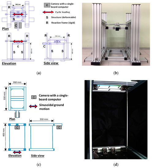 The proposed method to estimate the inter-story responses was verified by a set of reduced scale experiments. Considering the high cost of a full-scale structural test and the infeasibility of deforming a real building, the verification was performed by carrying out a series of one-tenth scaled structural experiments. Two sets of experiments were carried out: static and dynamic experiments. The static experiments are used to investigate the accuracy of the proposed method for slow deformations, where the applications of the proposed system are for monitoring the residual deformation and slow deformation induced by creep, subsidence, or slow responses. The dynamic experiments are used to represent the dynamic inter-story responses induced by earthquakes. The dimensions of the specimens and the accessories are displayed in the structural design plots shown in Figure 5. The camera resolution was set to 640 by 480 pixels, not higher than most of the surveillance cameras nowadays. Figure 5d displays the overall specimen, which was taken by another camera.