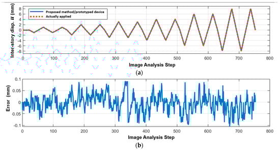 A comparison of the actual applied inter-story drift and the measured inter-story u is shown in Figure 6. The errors between the actual applied and measured inter-story responses u at the peaks are generally smaller than 0.1 mm. The maximum 0.1 mm error is equivalent to 0.1 pixels of positioning error in image point tracking and is equivalent to a 0.025% inter-story drift ratio, or a 1-mm accuracy if the specimen is scaled to full scale, which is relatively small. While this accuracy is not comparable to conventional displacement devices such as an LVDT, which normally achieves an accuracy of 0.05 mm, the accuracy of the proposed method is capable of measuring significant inter-story responses in practical applications.